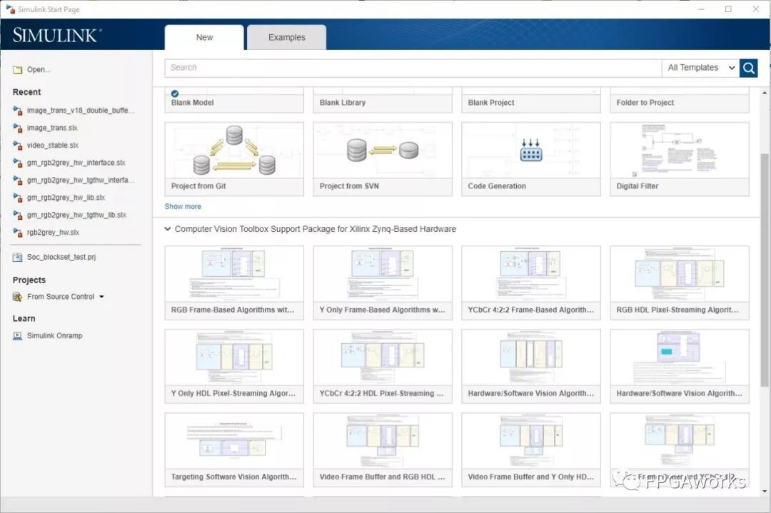 First, open the Simulink Start Page click the corresponding package, and select RGB HDL Pixel-Streaming Algorithm with Zynq.