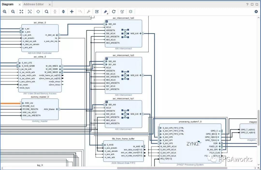 Finally, let’s examine the generated Block Design. Two DMAs transfer data via HP0 and HP3. One is Xilinx’s AXI DMA, and the other is ADI’s DMA Controller—the latter is the active DMA. The former connects to a FIFO on both ends, but the FIFO isn’t connected to other modules.