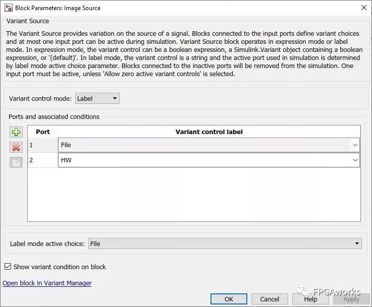 We can see the model is divided into five parts: Source, Conversion, Algorithm, Conversion, and Display. As a verification platform, users can choose to use a video file from the PC or a camera/HDMI source connected to the FPGA. Double-click Image Source to select your video source.