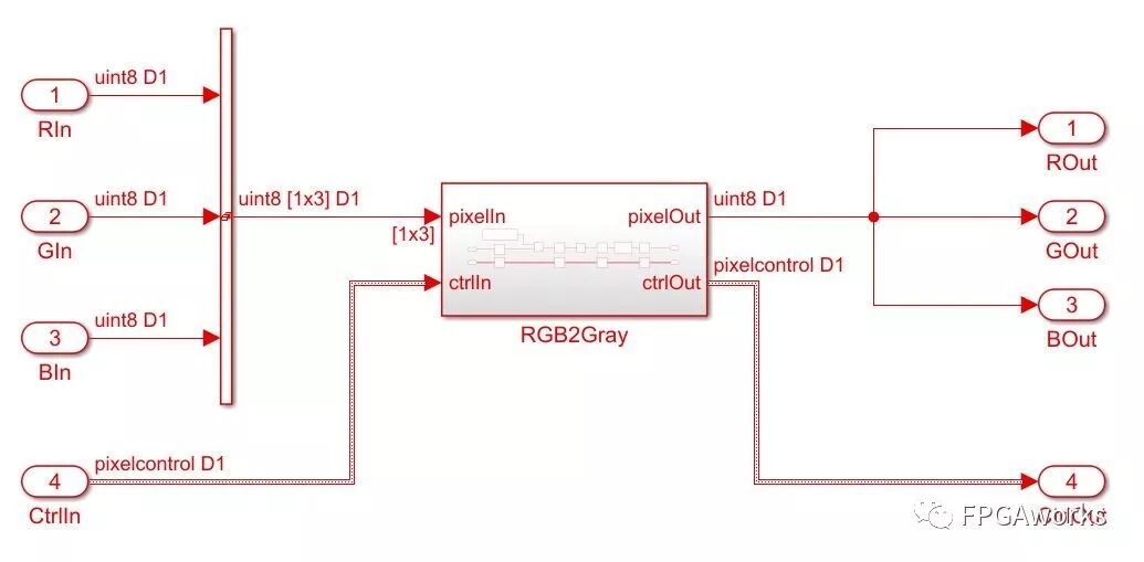 Because our module’s input and output are pixel-based, we must recombine the three RGB channels and connect the pixelOut signal to the output RGB channels to produce the grayscale output.