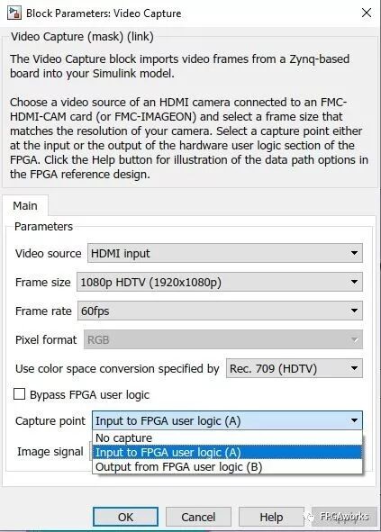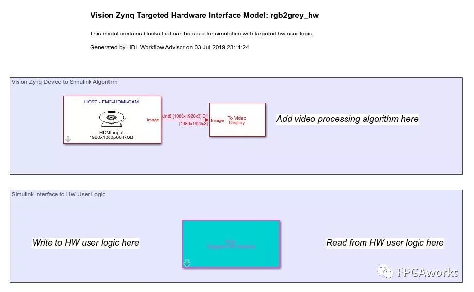 Using these, we can create an emulation environment. The first runs purely in hardware, while the second supports hardware-software co-simulation (the ARM processor configures hardware IP registers via AXI-Lite; our module lacks such configuration, so we’ll cover this later). Simulink also provides a capture module, allowing visualization without connecting a physical display.